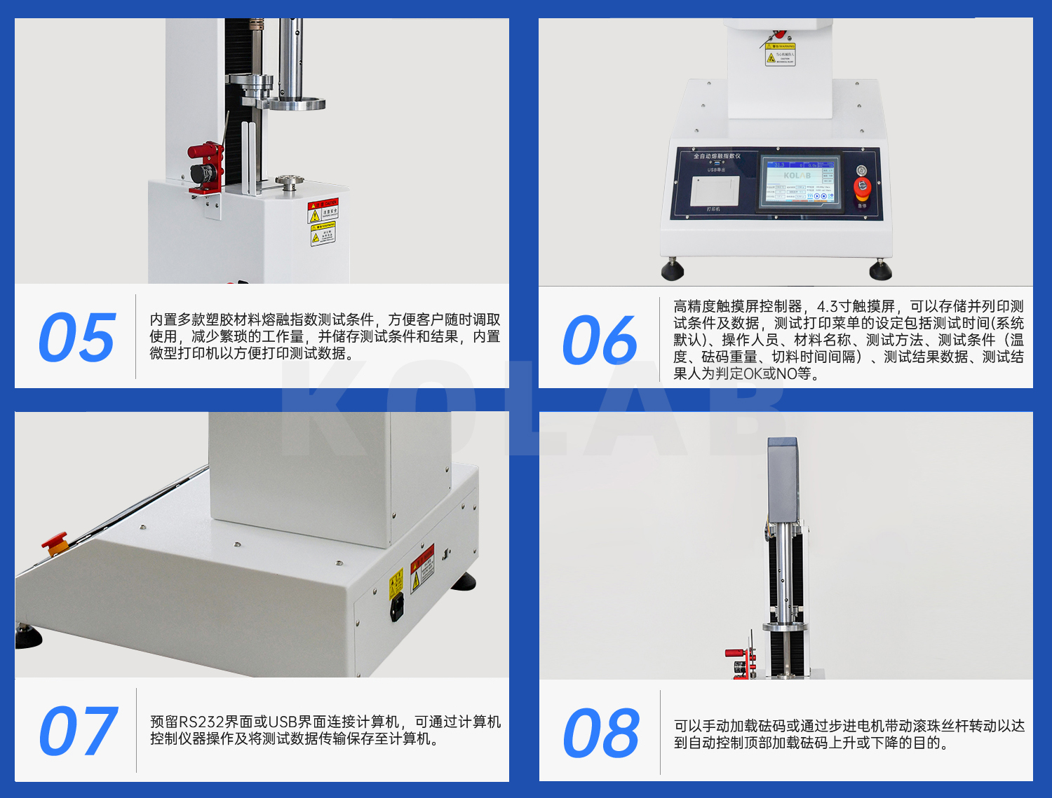 高*度全自動熔融指數(shù)儀,用于測定各種塑膠、樹脂在粘流狀態(tài)時通過*定的溫度和負荷,每10min通過標準口模 熔體流動速率MFR/MVR值,它適用于熔融溫度較高的聚碳酸酯、聚芳砜、氟塑膠、尼龍等工程塑膠,也適用于聚乙烯(PE)、聚苯乙烯(PS)、聚丙烯(PP)、ABS樹脂、聚甲醛(POM)、聚碳酸酯(PC)樹脂等熔融溫度較低的塑膠測試,廣泛地應用于塑膠生產(chǎn),塑膠制品、石油化工等行業(yè)以及相關院校、科研單位和商檢部門。