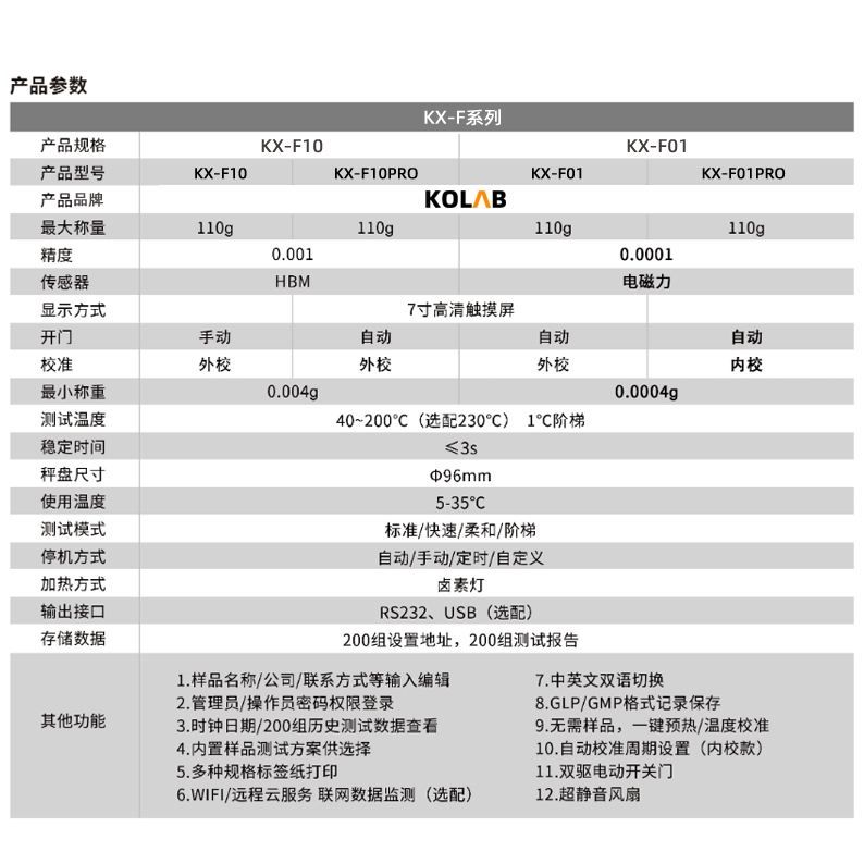 KX-F系列智能水分測(cè)定儀集成了KOLAB 科西水分測(cè)定成熟技術(shù),使整個(gè)分析系統(tǒng)更加**善。采用高效率的烘干加熱器-高品質(zhì)環(huán)狀鹵素?zé)暨M(jìn)行加熱,對(duì)樣品進(jìn)行快速、均勻的加熱;儀器設(shè)計(jì)智能化、簡(jiǎn)單化,實(shí)現(xiàn)了用戶*鍵式測(cè)量功能,*需**業(yè)知識(shí)。因*同行業(yè)對(duì)水分有著*同的定義,為滿足用戶的需求,KX-F系列內(nèi)置多種水分顯示方式,包括但*限于含水率、固含量、回潮率、木材含水率等多種模式,并針對(duì)*同行業(yè)的*同樣品,儀器預(yù)留了多種用戶自定義測(cè)定方法,用戶可根據(jù)實(shí)際需求設(shè)置測(cè)量模式,自定義程序自動(dòng)儲(chǔ)存,調(diào)取方便、快速,滿足行業(yè)多種樣品的測(cè)定需求。該系列水分測(cè)定儀全金屬機(jī)身、支持高溫檢測(cè),升溫快、加熱均勻、使用簡(jiǎn)單、壽命長(zhǎng)等特點(diǎn)。